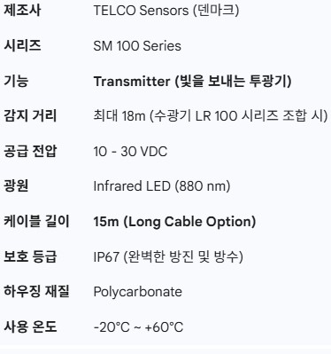 ⚠️ Çʼö È®ÀÎ: º» Á¦Ç°Àº **Åõ±¤±â(Transmitter)**ÀÔ´Ï´Ù. °¨Áö ½Ã½ºÅÛÀ» ±¸¼ºÇϱâ À§Çؼ´Â ºûÀ» ¹Þ´Â **¼ö±¤±â(Receiver, LR 100 ½Ã¸®Áî)**°¡ ¹Ýµå½Ã ÇÔ²² ¼³Ä¡µÇ¾î¾ß ÇÕ´Ï´Ù.