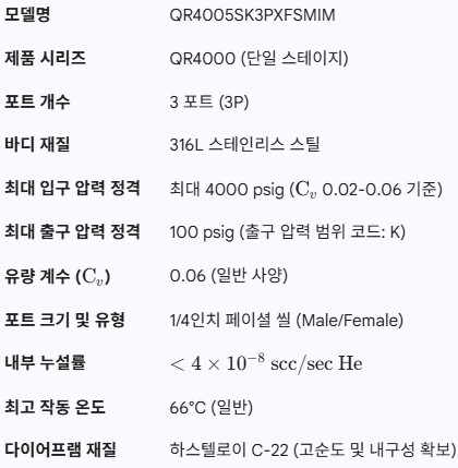 🌟 PARKER ÃÊ°í¼øµµ 3Æ÷Æ® ·¹±Ö·¹ÀÌÅÍ (QR4005SK3PXFSMIM) »óǰ »ó¼¼ ÆäÀÌÁö 🌟 ¸ðµ¨¸í: QR4005SK3PXFSMIM ½Ã¸®Áî: PARKER QR4000 ½Ã¸®Áî Á¦Ç° À¯Çü: °í¼øµµ(High Purity) ´ÜÀÏ ½ºÅ×ÀÌÁö ¾Ð·Â ·¹±Ö·¹ÀÌÅÍ