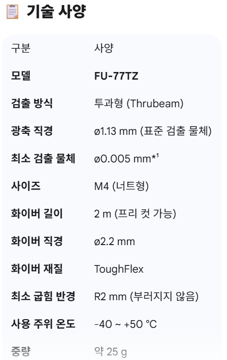 KEYENCE (Ű¿£½º) FU-77TZ ÈÀ̹ö À¯´Ö (Åõ°úÇü) ✨ Á¦Ç° °³¿ä KEYENCE FU-77TZ´Â Á¤¹ÐÇÑ °ËÃâ ¾ÖÇø®ÄÉÀ̼ÇÀ» À§ÇØ ¼³°èµÈ Åõ°úÇü (Thrubeam) ±¤ ÈÀ̹ö À¯´ÖÀÔ´Ï´Ù. ¶Ù¾î³ ³»±¸¼º°ú À¯¿¬¼ºÀ» Á¦°øÇÏ´Â ToughFlex ÀçŶ ÄÉÀ̺íÀÌ Æ¯Â¡À̸ç, ÄÞÆÑÆ®ÇÑ M4 »çÀÌÁî·Î Á¼Àº °ø°£¿¡¼µµ Á¤¹ÐÇÑ ¼¾½ÌÀÌ °¡´ÉÇÕ´Ï´Ù. ÀÚµ¿È »ý»ê ¶óÀÎ, ÀÚÀç ó¸® ½Ã½ºÅÛ, ǰÁú °ü¸® ½ºÅ×ÀÌ¼Ç µî ´Ù¾çÇÑ »ê¾÷ ÀÚµ¿È ºÐ¾ß¿¡ ÀÌ»óÀûÀÎ ¼Ö·ç¼ÇÀÔ´Ï´Ù. 🔑 ÁÖ¿ä Æ¯Â¡ ¹× ÀåÁ¡ Åõ°úÇü (Thrubeam) °ËÃâ ¹æ½Ä: ³ôÀº Á¤¹Ðµµ¿Í ±ä °ËÃ⠰Ÿ®¸¦ Á¦°øÇÏ¿© ¾ÈÁ¤ÀûÀÎ °ËÃâ ¼º´ÉÀ» º¸ÀåÇÕ´Ï´Ù. M4 ¼ÒÇü »çÀÌÁî: À°°¢ ³ÊÆ® ¸ð¾çÀÇ M4 Å©±â·Î Çù¼ÒÇÑ °ø°£À̳ª Àåºñ¿¡ ½±°Ô ¼³Ä¡ÇÒ ¼ö ÀÖ½À´Ï´Ù. ToughFlex (ºÎ·¯ÁöÁö ¾ÊÀ½) ÄÉÀ̺í: ÃÖ¼Ò ±ÁÈû ¹Ý°æÀÌ R2 mm·Î ¸Å¿ì À¯¿¬Çϸ鼵µ ÀæÀº ¿òÁ÷ÀÓÀ̳ª ±ÁÈû¿¡µµ °ÇÑ ³»±¸¼ºÀ» ÀÚ¶ûÇÕ´Ï´Ù. ÇÁ¸® ÄÆ (Free-cut) °¡´É: 2mÀÇ ÈÀ̹ö ±æÀ̸¦ Çʿ信 µû¶ó ÀÚÀ¯·Ó°Ô Àç´ÜÇÏ¿© »ç¿ëÇÒ ¼ö ÀÖ¾î ¼³Ä¡ À¯¿¬¼ºÀÌ ³ô½À´Ï´Ù. ±¤¹üÀ§ÇÑ ³»È¯°æ¼º: -40¡ÆC¿¡¼ +50¡ÆC±îÁö ³ÐÀº »ç¿ë ÁÖÀ§ ¿Âµµ¸¦ Áö¿øÇÏ¿© ±ØÇÑÀÇ È¯°æ¿¡¼µµ ¾ÈÁ¤ÀûÀÎ ÀÛµ¿ÀÌ °¡´ÉÇÕ´Ï´Ù.