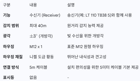 LR 110 TB38 5´Â TELCO SensorsÀÇ **¿ø°Ý ±¤Àü ½Ã½ºÅÛ(Remote Photoelectric Systems)**À» À§ÇÑ Ç¥ÁØ ¼ö½Å±â(Receiver)ÀÔ´Ï´Ù. °ß°íÇÑ ¼³°è¿Í ¶Ù¾î³­ ³»±¸¼ºÀ¸·Î ¸Õ °Å¸®¿¡¼­µµ ¾ÈÁ¤ÀûÀÎ °¨Áö ¼º´ÉÀ» Á¦°øÇϸç, ƯÈ÷ ¿­¾ÇÇÏ°í ±î´Ù·Î¿î »ê¾÷ ȯ°æ¿¡ ÃÖÀûÈ­µÇ¾î ÀÖ½À´Ï´Ù.
