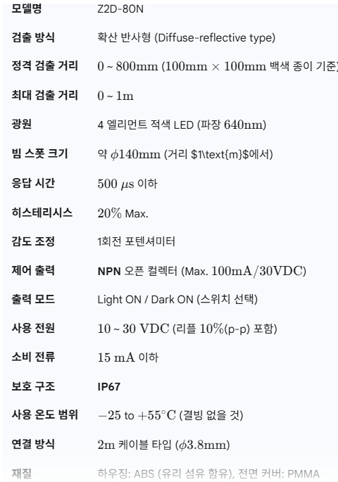 ✨ OPTEX Æ÷Åä¼¾¼ Z2D-80N (È®»ê ¹Ý»çÇü) OPTEX SENSOR Z2D-80NÀº ÄÄÆÑÆ®ÇÑ Å©±â¿¡ ¶Ù¾î³ ¼º´ÉÀ» °âºñÇÑ È®»ê ¹Ý»çÇü(Diffuse-reflective type) ±¤Àü ¼¾¼ÀÔ´Ï´Ù. OPTEXÀÇ µ¶ÀÚÀûÀÎ Opto-ASIC ¹× ½Å±Ô 4°³ ¿¤¸®¸ÕÆ® Àû»ö LED ±¤¿øÀ» äÅÃÇÏ¿© ³ôÀº °ËÃâ ¾ÈÁ¤¼º°ú ±ä °¨Áö °Å¸®¸¦ ½ÇÇöÇϸ鼵µ, °æÁ¦ÀûÀ̰í ģȯ°æÀûÀÎ ¿î¿µÀ» °¡´ÉÇÏ°Ô ÇÕ´Ï´Ù.