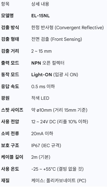 💡 Á¦Ç° °³¿ä (Product Overview) "°ø°£ Á¦¾à ¾ø´Â ¼³Ä¡, ¾ÈÁ¤ÀûÀÎ ¹è°æ ¾ïÁ¦ ¼º´É" OPTEX EL-15NLÀº µÎ²²°¡ ´Ü 3.5mm¿¡ ºÒ°úÇÑ ¾÷°è ÃÖ°í ¼öÁØÀÇ ÃʹÚÇü ±¤Àü ¼¾¼ÀÔ´Ï´Ù. ÇÑÁ¤ ¹Ý»çÇü(Convergent Reflective) ¹æ½ÄÀ» äÅÃÇÏ¿© °ËÃâ ¹°Ã¼ µÚÆíÀÇ ¹è°æ ¿µÇâÀ» ÃÖ¼ÒÈÇϸç, Çù¼ÒÇÑ Àåºñ ³»ºÎ³ª Á¤¹Ð ±â°è ºÎǰ °ËÃâ¿¡ ÃÖÀûÈµÈ ¼Ö·ç¼ÇÀÔ´Ï´Ù.