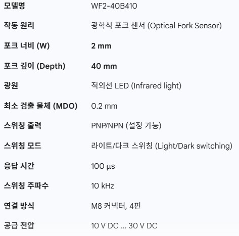 [SICK] WF2-40B410 ÃÊÁ¤¹Ð Æ÷Å© ¼¾¼ (Fork Sensor) °í¼Ó °øÁ¤À» À§ÇÑ ÃÖ°íÀÇ ¼±ÅÃ, ±ØÇÑÀÇ Á¤¹ÐÇÔ°ú °£ÆíÇÑ ¼³Á¤ 1. Á¦Ç° °³¿ä (Product Overview) SICK WF2-40B410Àº ¼Û½Å±â¿Í ¼ö½Å±â°¡ ÇϳªÀÇ ÇϿ졿¡ ÅëÇÕµÈ 'U'ÀÚÇü Æ÷Å© ¼¾¼ÀÔ´Ï´Ù. º°µµÀÇ Á¤·Ä ÀÛ¾÷ÀÌ ÇÊ¿ä ¾ø¾î ¼³Ä¡°¡ ¸Å¿ì °£ÆíÇϸç, °í¼ÓÀ¸·Î À̵¿ÇÏ´Â ¶óº§, ¸¶Å©, ºÎǰ µîÀ» ¿ÀÂ÷ ¾øÀÌ °¨ÁöÇÕ´Ï´Ù. Àû¿Ü¼± ±¤¿øÀ» »ç¿ëÇÏ¿© ºÒÅõ¸íÇÑ ¹°Ã¼¸¦ È®½ÇÇÏ°Ô °ËÃâÇÏ´Â µ¥ ÃÖÀûȵǾî ÀÖ½À´Ï´Ù.