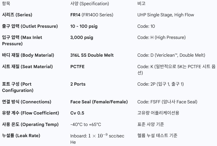 Parker Hannifin FR1400 Series High Flow Regulator¸ðµ¨¸í: FR1410HD5K2PFSFF[Âü°í¿ë À̹ÌÁöÀÔ´Ï´Ù] 1. Á¦Ç° °³¿ä (Product Overview)Parker Veriflo FR1400 ½Ã¸®Áî´Â ¹ÝµµÃ¼ Á¦Á¶ °øÁ¤ ¹× ±âŸ ÃÊ°í¼øµµ(UHP) °¡½º °ø±Þ ¶óÀÎÀ» À§ÇØ ¼³°èµÈ °íÀ¯·® °¨¾Ð ·¹±Ö·¹ÀÌÅÍÀÔ´Ï´Ù. ÀÌ Á¦Ç°Àº Tied-Diaphragm(ŸÀÌµå ´ÙÀ̾îÇÁ·¥) ¼³°è¸¦ äÅÃÇÏ¿© ¾ÈÁ¤ÀûÀÎ ¾Ð·Â Á¦¾î¿Í Ź¿ùÇÑ ¹ÐºÀ ¼º´ÉÀ» Á¦°øÇϸç, ÃÖ´ë 800 slpmÀÇ ³ôÀº À¯·®À» ó¸®ÇÒ ¼ö ÀÖ¾î Bulk Gas ½Ã½ºÅÛÀ̳ª VMB(Valve Manifold Box) µî¿¡ ÀÌ»óÀûÀÔ´Ï´Ù. ¸ðµ¨ FR1410HD5K2PFSFF´Â **°í¾Ð ÀÔ·Â(3000 psig)**°ú Double Melt 316L ½ºÅ×Àθ®½º ½ºÆ¿ ¹Ùµð¸¦ Àû¿ëÇÏ¿© ÃÖ°íÀÇ ¼øµµ¿Í ³»½Ä¼ºÀ» º¸ÀåÇÕ´Ï´Ù.